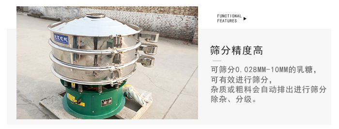 1、篩分精度高可篩分0.028mm-10mm的乳糖,可有效進行篩分,雜質(zhì)或粗料會自動排出進行篩分、除雜、分級。篩分過程中乳糖過網(wǎng)率達95%以上。篩分精度高。