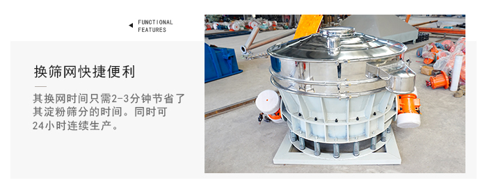 直排篩利用獨特:電動偏心軸的振動原理,使其能夠實現多層震動篩同時篩分的作用,從而可以提高了其篩分的精細度。同時其可24小時連續生產,獨特的換篩網快捷便利:其換網時間只需2-3分鐘節省了其淀粉篩分的時間。所以其價格是可以選擇的。