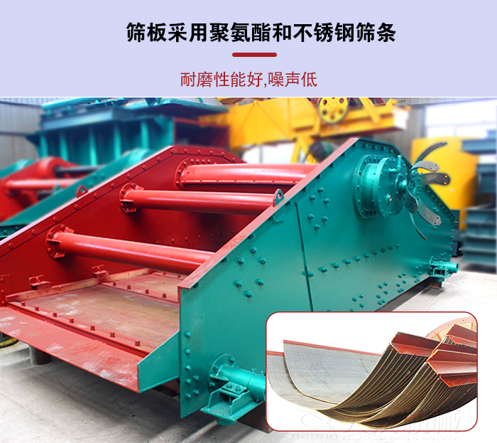 1,篩板采用聚氨酯和不銹鋼篩條制作,篩板四周用聚氨酯材料,具有耐磨性能好,噪聲低的特點。