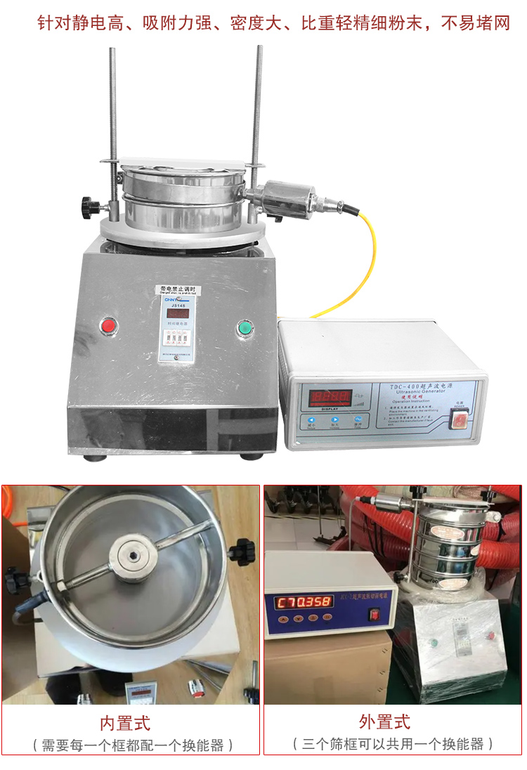 在標準檢驗篩基礎(chǔ)上增加了超聲波篩分系統(tǒng),解決了篩分200目以上高目數(shù)產(chǎn)品或普通檢驗篩難以篩分的易結(jié)塊、易帶靜電的產(chǎn)品的難題,并防止篩網(wǎng)堵塞。