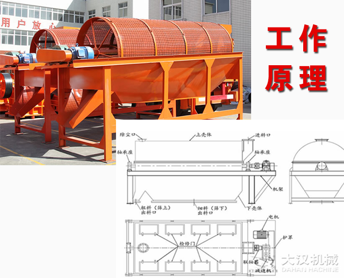滾筒篩篩沙機主要由電機、減速機、滾筒裝置、機架、密封蓋、進料口、出料口等部分組成。滾筒裝置傾斜安裝于機架上。電動機經減速機與滾筒裝置通過聯軸器連接在一起,驅動滾筒裝置繞其軸線轉動。當物料進入滾筒裝置后,由于滾筒裝置的傾斜與轉動,使篩面上的物料翻轉與滾動,使合格物料(篩下產品)經滾筒后端底部的出料口排出,不合格的物料(篩上產品)經滾筒尾部的排料口排出。由于物料在滾筒內的翻轉、滾動,使卡在篩孔中的物料可被彈出,防止篩孔堵塞。